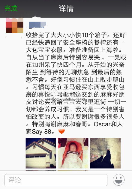 喜多月子中心罗兰岗分馆中,来自上海浦东的赴美生子宝妈即将带宝宝启程回国了,最近一直在收拾行李的宝妈在朋友圈里面分享了一些这四个月来在洛杉矶待产生宝宝的过程中的心情,妈妈十分的舍不得,的确,时间过得很快,赴美生子之旅也并不像妈妈们之前所认为的那样漫长,相信这段经历会成为宝妈们最为怀念的一段幸福的回忆。