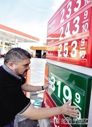 洛杉矶油价持续下降,再创新低,洛县昨日油价平均每加仑3.533元,是自2011年2月18日以来的最低价格,民众久盼油价跌,此次跌破3.6,民众乐开花。根据洛杉矶汽车俱乐部和油价信息中心数据,洛县平均油价连续18日下跌,比一周前下降10.4美分,比一月前降低23.1美分,比去年同期降低26.3美分。橙县油价在过去17日内连续下跌,昨日降到平均每加仑3.514元,是2011年12月22日以来的最低价格,比一周前下降9.4美分,比一月前降低21.4美分,比去年同期降低24.6美分。