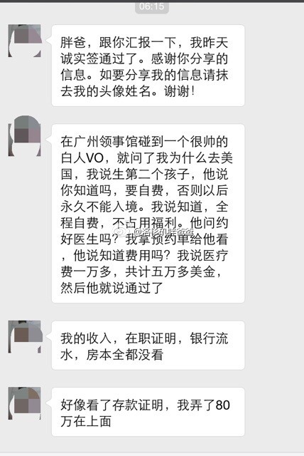 这位客人在广州领事馆面签,是一个很帅的白人VO,就问了客人为什么去美国。在得知去生孩子之后,他说要自费否则以后不能入境!客人保证全程自费,不占用美国福利!他又问约好医生吗,知道相关费用吗?客人提前都做好了准备,医生预约单以及费用概况都一一作答,就通过了。看了存款证明,但是收入、在职证明,银行流水,房本全都没看。