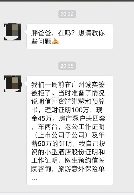 “我们一周前在广州诚实签被拒绝了,当时准备了情况说明信,资产汇总和预算书,理财证明100万,现金45万,房产深户共4套,车两台,老公工作证明(上市公司子公司)及年薪50万的证明,我自己投资的小型酒店股份证明和工作证明,医生预约信医院咨询,旅游意外保险单······”