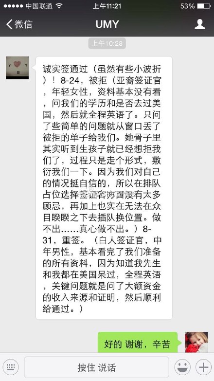 一星期后,这对客人进行了第二次面签。这次是以为中年白人男性签证官,基本看完了他们提供 的全部证明资料哦,因为知道二人在美国待过,也是全程英语,重点问了他们大额资金的收入来源和证明。大家看到这里该明白了吧,证明有足够能力自费生产非常重要,面签官对赴美生子一事不怀偏见也十分重要!二签诚实签顺利通过,恭喜他们!
