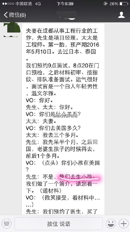 首先问了二人的关系,预计在美国停留多长时间。因为此趟,夫妻二人选择做诚实签,便在回答过程中如实将自己的赴美目的告知,自己是去美国生孩子的,先生待半个月回国,待妻子要生产时再赴美陪伴,加上产妇坐月子的时间,前后是三个月左右。