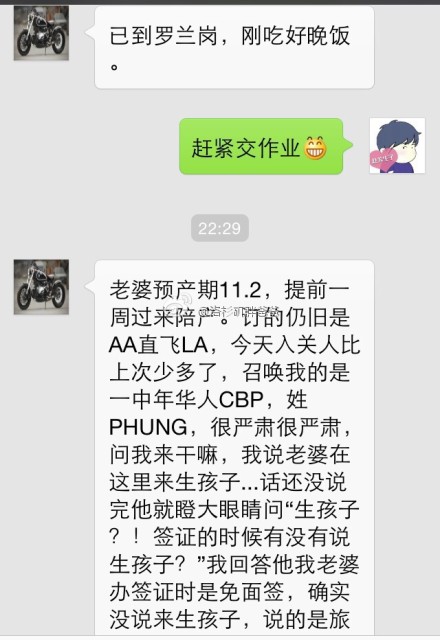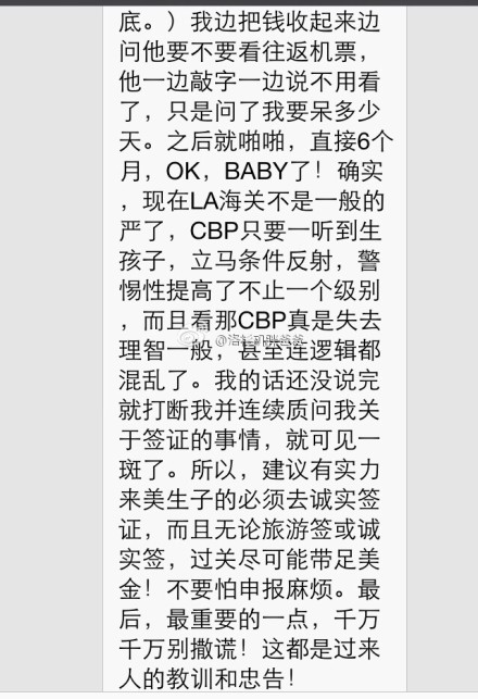 今天要分享的这个案例是一位浙江宁波的宝爸,他是提前一周去洛杉矶陪产的,当时办理的签证是旅游签证,诚实过海关,他过海关的时候可以说是比较惊险的,遇到了一位中年华人CBP官员,姓PHUNG,传言说这位工作官员非常的严厉,据说还遣返过很多孕妈妈呢。