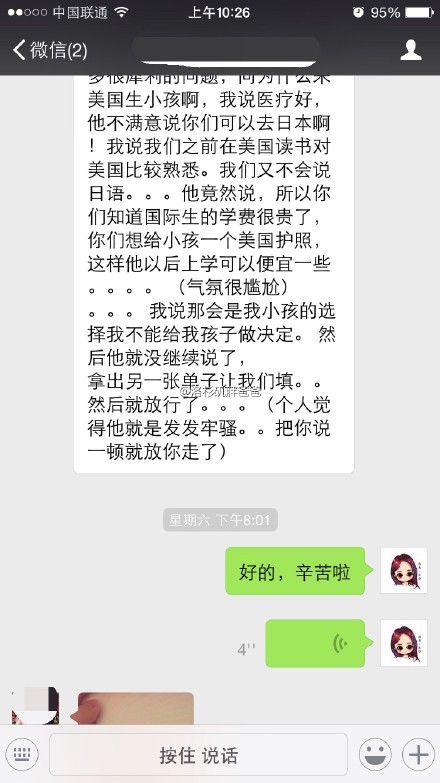 【恭喜北京客人顺利入境美国】北京人,26岁,第一胎,预产期5月初,夫妻双方都从事于金融行业,数年美国留学经历,出入境记录良好。夫妻两人携3万美金入境洛杉矶,诚实告知赴美生子真实目的。虽遇见发牢骚的边检官员,可仍然顺利入境,入住喜多月子中心尔湾分馆,欢迎!