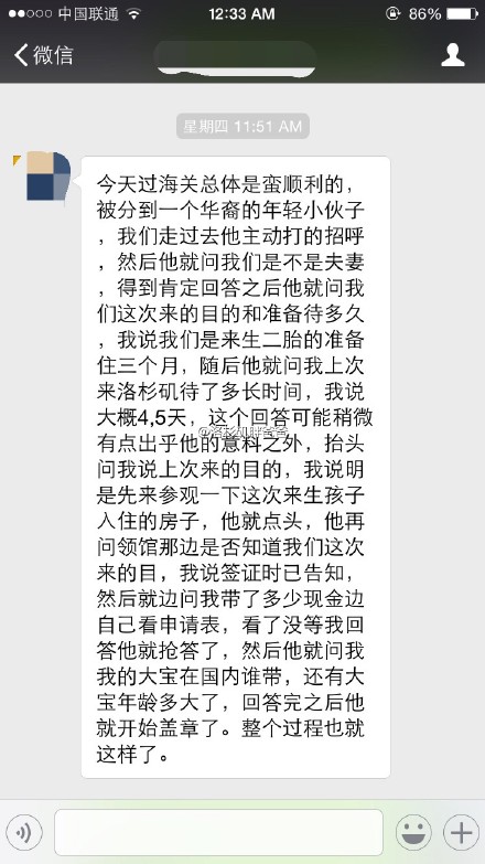 过程十分简单,年轻的华裔小伙子简单问了几个问题,来美国的目的,打算在美国待多久等常规性问题。佛山客人解释上一次在洛杉矶几天的时间,特地来当地考察住宿、医院以及交通。最后顺利通行~