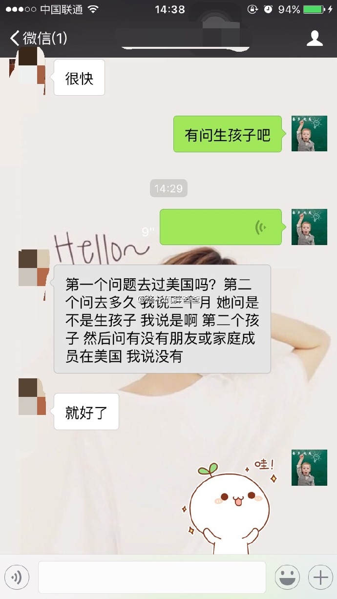 客人也跟我们简分享了面签的经过“面签官一共就问了三个问题,第一个问题就是去过美国吗?会带是去过!第二个问题是:打算去美国待多久?回答:三个月左右!第三个问题:是不是去美国生孩子?回答:是的,去美国生自己的第二个孩子!最后面签官还补充了一句,美国那边有没有朋友或者家庭成员?回答:没有!最后面签官就说恭喜你已经通过了!”