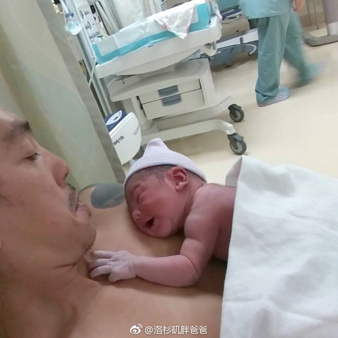 这次,爸爸也跟宝宝来了次Skin to skin的亲密接触。肉嘟嘟的宝宝趴在爸爸身上,爸爸也是高兴地合不拢嘴。