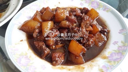 “又一个宝宝的满月酒,我的杰作海参红烧肉,祝可爱的宝宝回国后健健康康,顺顺利利,快快乐乐。”
