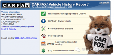 顺便介绍一下买二手车必备CarFax. 它是一家在北美(美国,加拿大)提供车辆历史报告的机构,只要将车辆的VIN号码(车辆身份码 – 共17位,在驾驶位前挡风玻璃下可以看到) 输入该网站,即可得到该车的历史报告,包括事故记录检查(Accident Check),里程检查 (Mileage Check),召回记录检查 (Recall Check), 尾气检查(Emissions Inspection)是否通过,甚至该车被买卖次数等重要记录,对买二手车很有帮助。可以几个人一起买一个短期帐号Share一下。