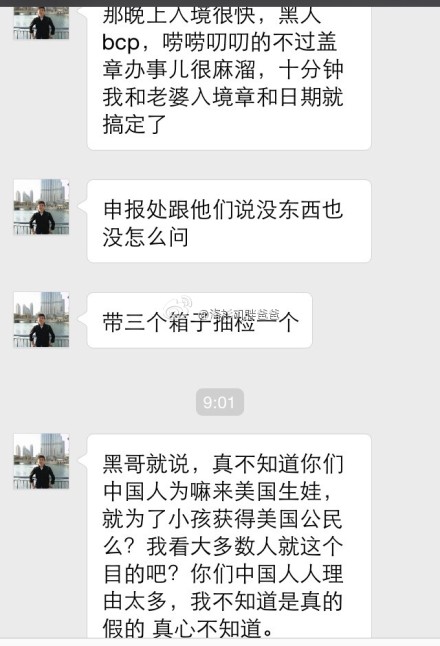 宝爸:嗯,我有空那相机拍一下,手机像素不好。那晚上入境很快,黑人CBP唠唠叨叨的不过盖章办事儿很麻溜,十分钟我和老婆入境章和日期就搞定了,申报处跟他们说没东西也没怎么问,带三个箱子抽检一个,黑哥就说,真不知道你们中国人为什么来美国生娃,就为了小孩子获得美国公民吗?我看大多数人就这个目的吧?你们中国人理由太多了,我不知道是真的假的,真心不知道。
