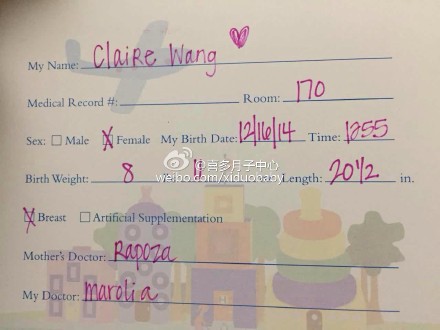 “我家小妞Claire于美国时间12月16日下午12:55分出生,重七斤九两,母女平安,谢谢各位亲朋好友的鼓励!人生起航! ”